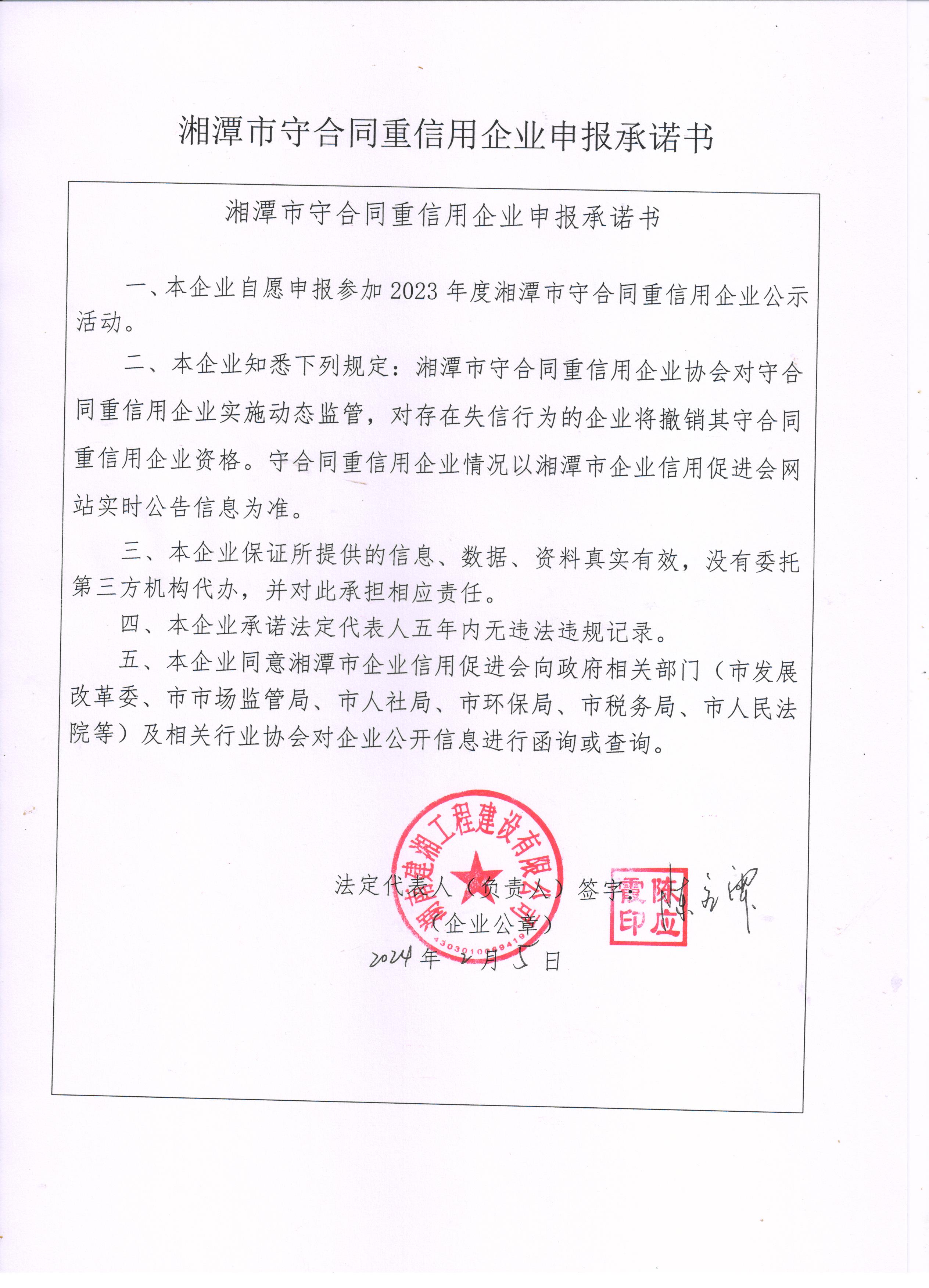 本企業(yè)根據(jù)《湘潭市守合同重信用企業(yè)申報規(guī)定》等編制 2023 年度企業(yè)信用報告書,并保證本報告書內(nèi)容真實、準(zhǔn)確、完整。