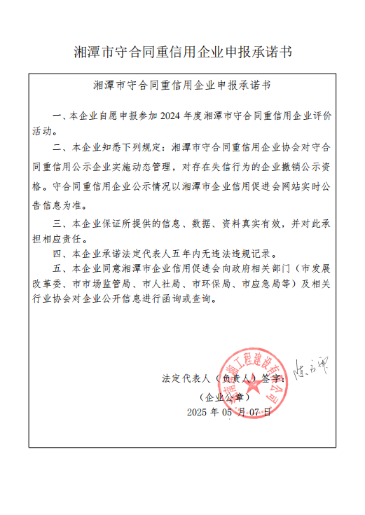 本企業(yè)根據(jù)《湘潭市守合同重信用企業(yè)申報規(guī)定》等編制 2024 年度企業(yè)信用報告書,并保證本報告書內(nèi)容真實、準(zhǔn)確、完整。
