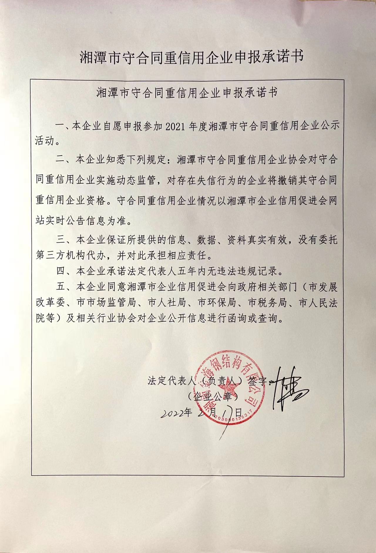 本企業(yè)根據(jù)《湘潭市守合同重信用企業(yè)申報規(guī)定》等編制 2021 年度企業(yè)信用報告書,并保證本報告書內(nèi)容真實、準(zhǔn)確、完整。