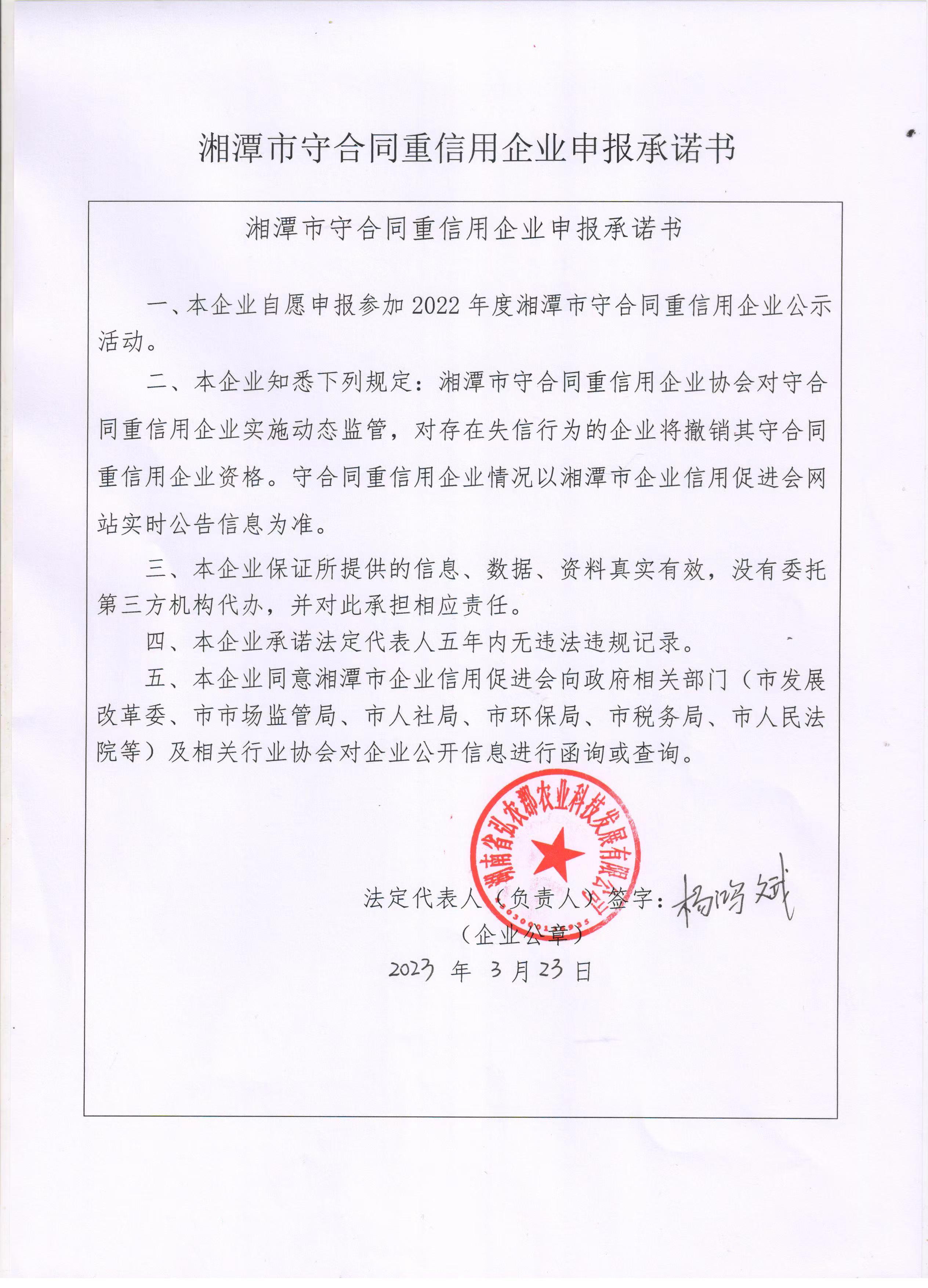 本企業(yè)根據(jù)《湘潭市守合同重信用企業(yè)申報(bào)規(guī)定》等編制 2022 年度企業(yè)信用報(bào)告書,并保證本報(bào)告書內(nèi)容真實(shí)、準(zhǔn)確、完整。