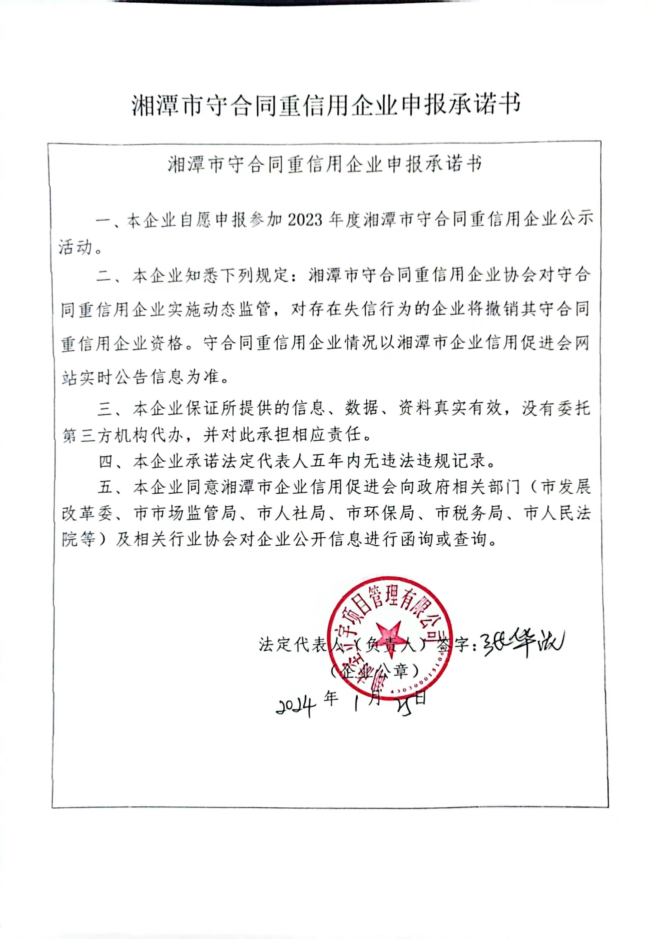 本企業(yè)根據(jù)《湘潭市守合同重信用企業(yè)申報(bào)規(guī)定》等編制 2023 年度企業(yè)信用報(bào)告書(shū),并保證本報(bào)告書(shū)內(nèi)容真實(shí)、準(zhǔn)確、完整。