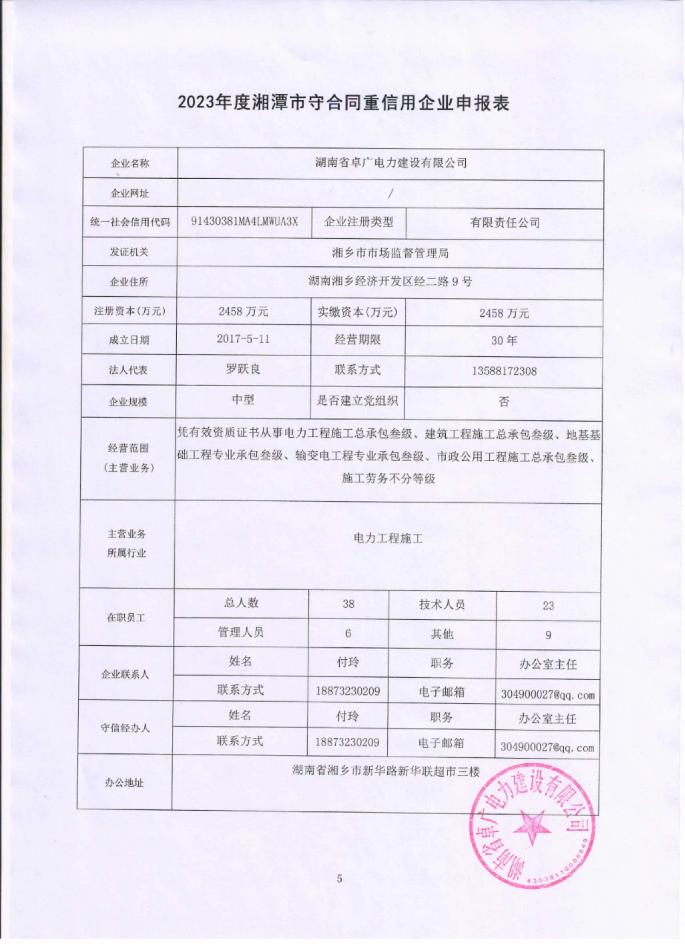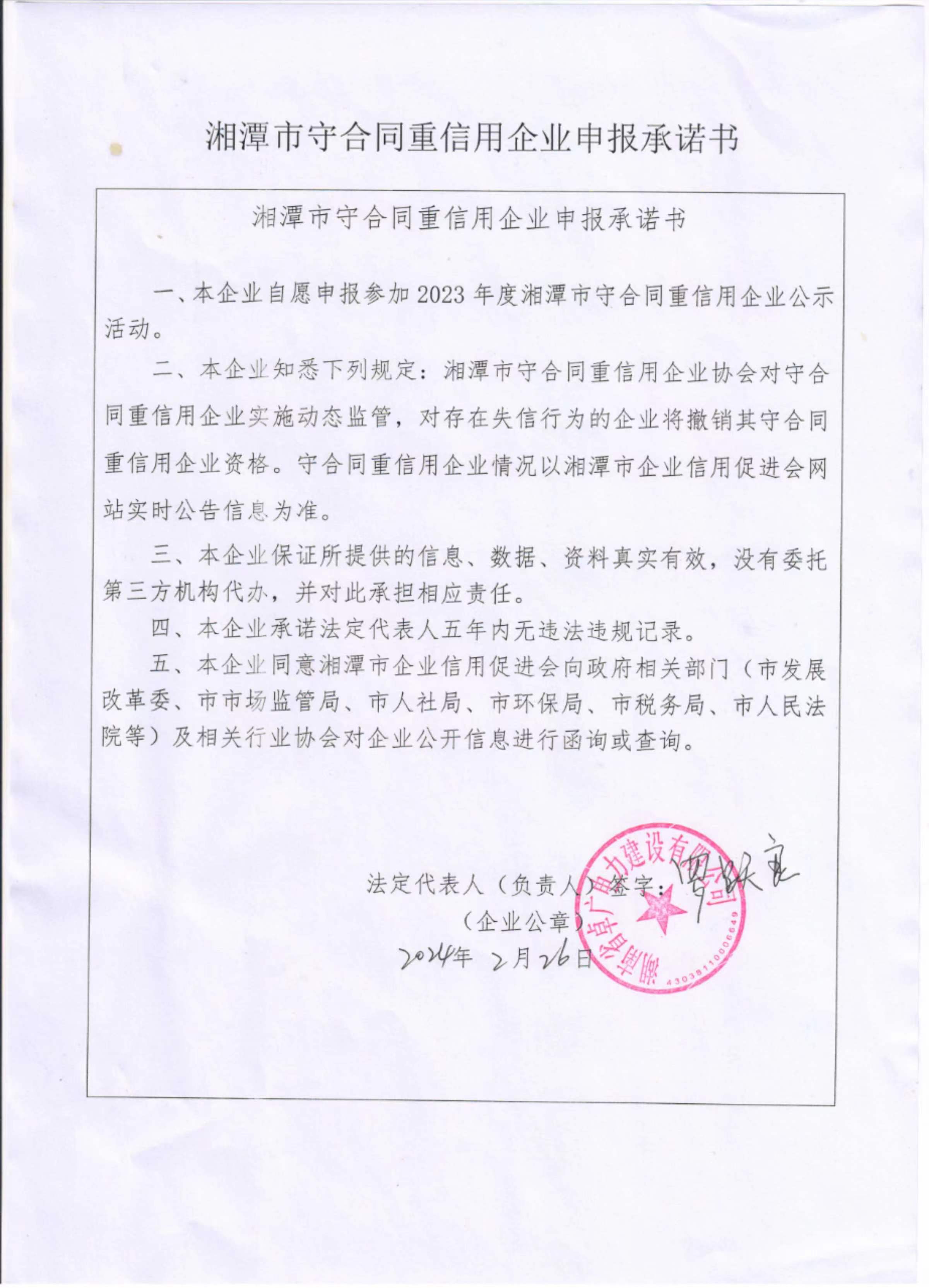 本企業(yè)根據(jù)《湘潭市守合同重信用企業(yè)申報規(guī)定》等編制 2023 年度企業(yè)信用報告書,并保證本報告書內(nèi)容真實(shí)、準(zhǔn)確、完整。