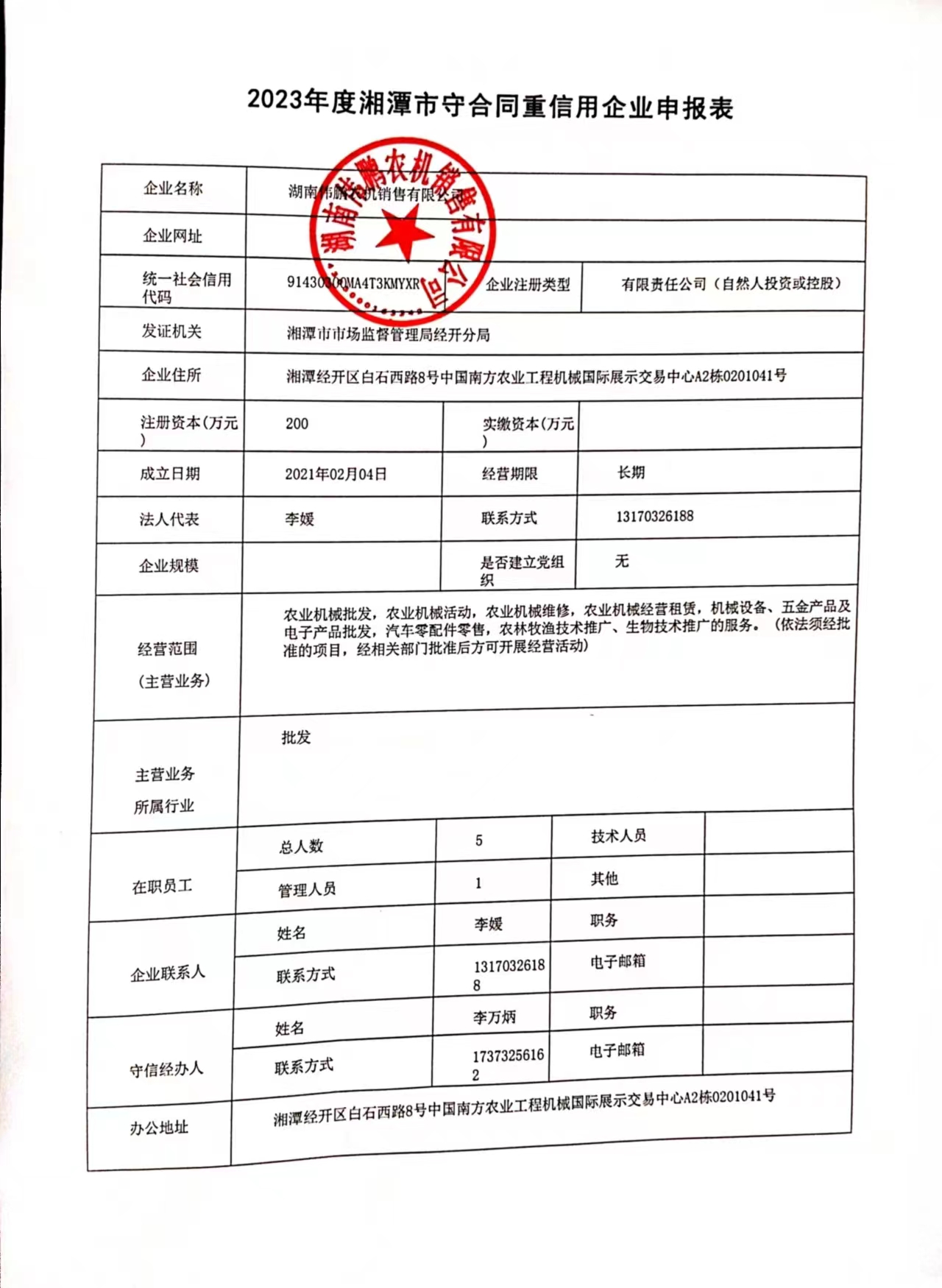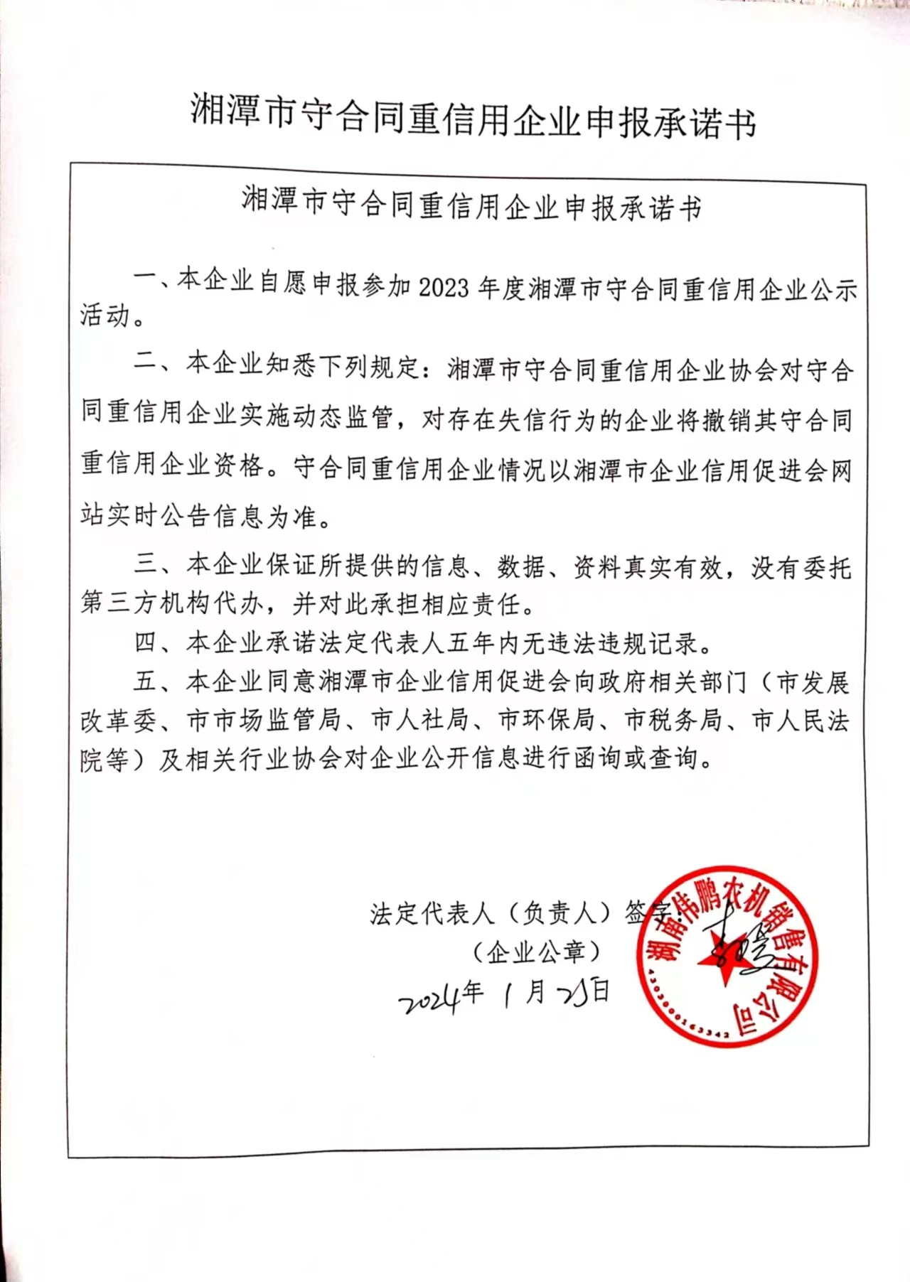 本企業(yè)根據(jù)《湘潭市守合同重信用企業(yè)申報(bào)規(guī)定》等編制 2023 年度企業(yè)信用報(bào)告書,并保證本報(bào)告書內(nèi)容真實(shí)、準(zhǔn)確、完整。