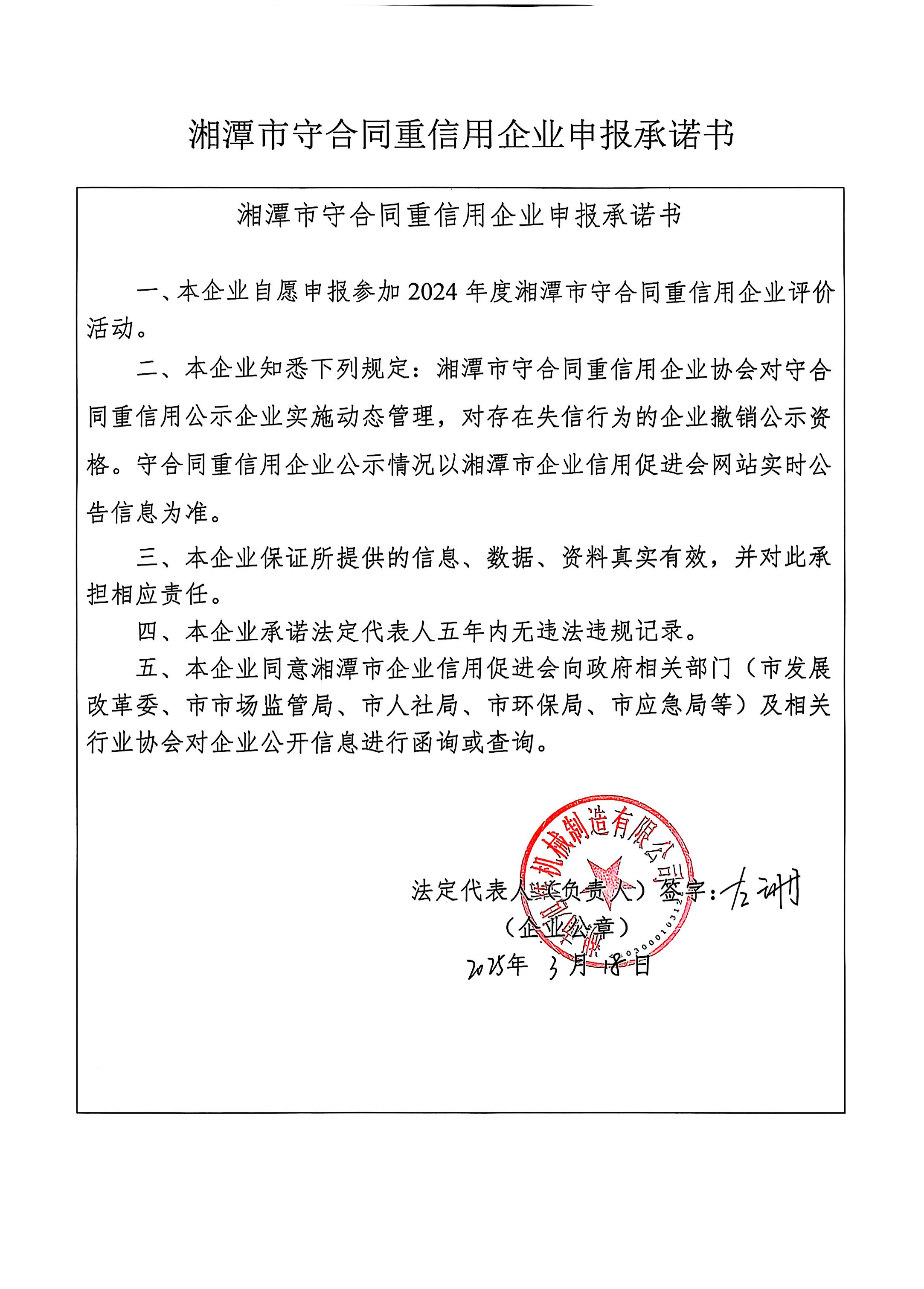 本企業(yè)根據(jù)《湘潭市守合同重信用企業(yè)申報規(guī)定》等編制 2024 年度企業(yè)信用報告書,并保證本報告書內容真實、準確、完整。