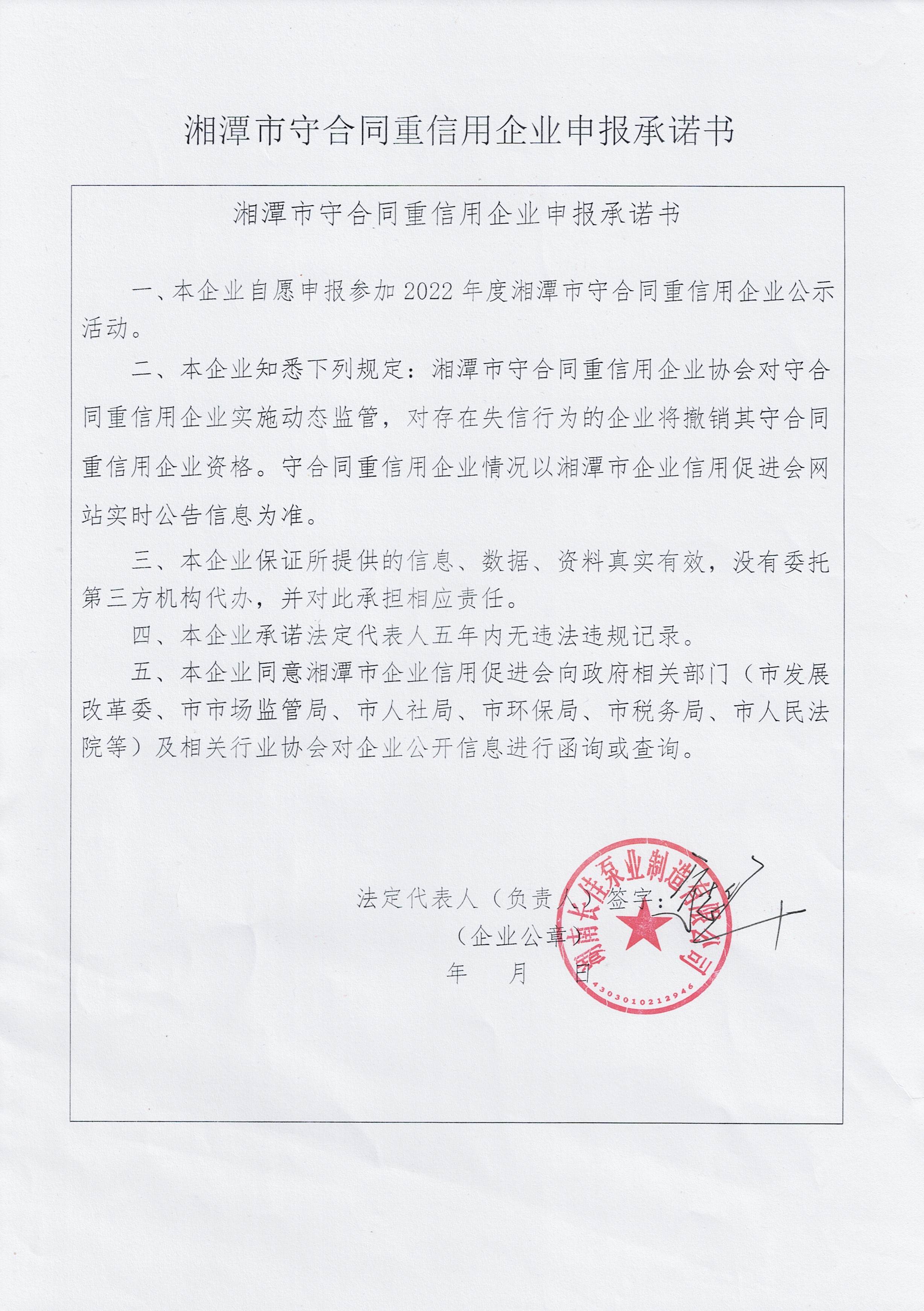 本企業(yè)根據《湘潭市守合同重信用企業(yè)申報規(guī)定》等編制 2022 年度企業(yè)信用報告書,并保證本報告書內容真實、準確、完整。