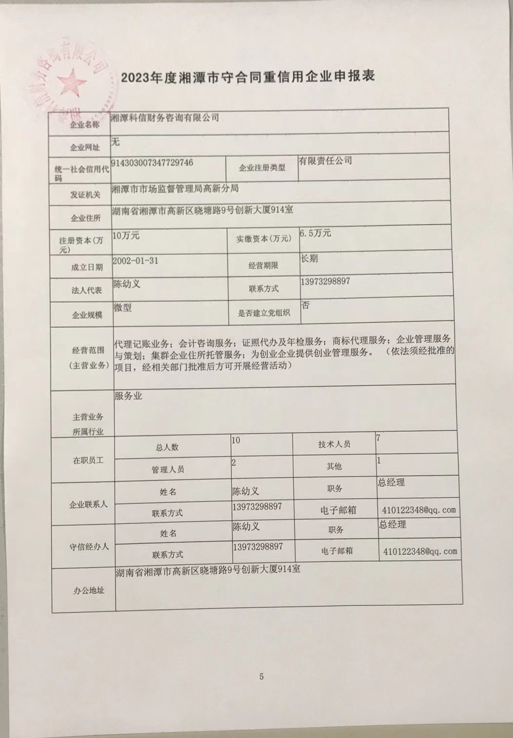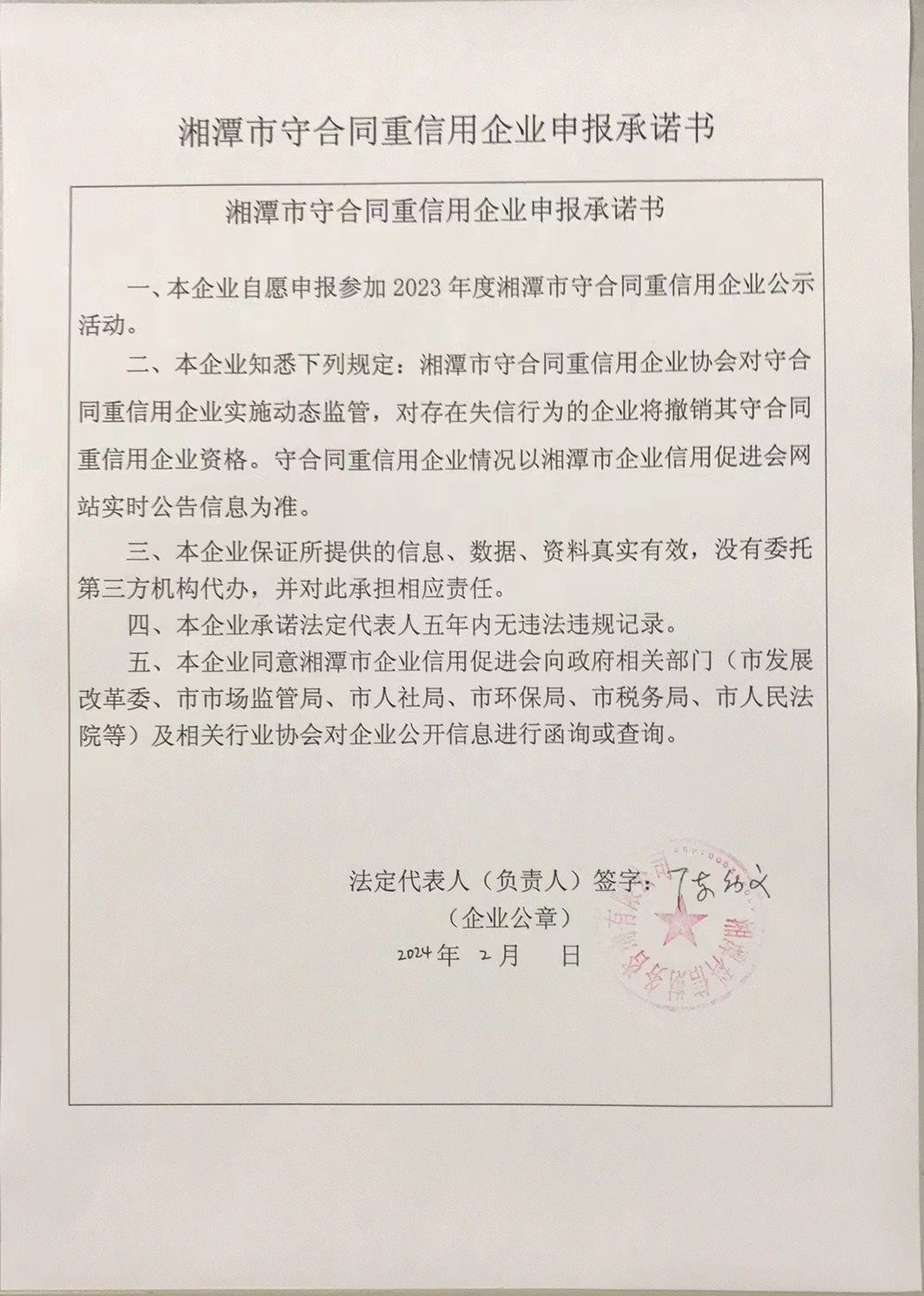 本企業(yè)根據(jù)《湘潭市守合同重信用企業(yè)申報(bào)規(guī)定》等編制 2023 年度企業(yè)信用報(bào)告書,并保證本報(bào)告書內(nèi)容真實(shí)、準(zhǔn)確、完整。